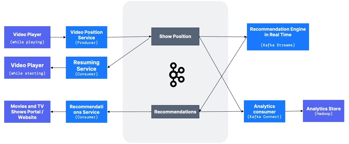 recommendationstopic- The Kafka Streams recommendation engine may source data from the analytics store for historical training.