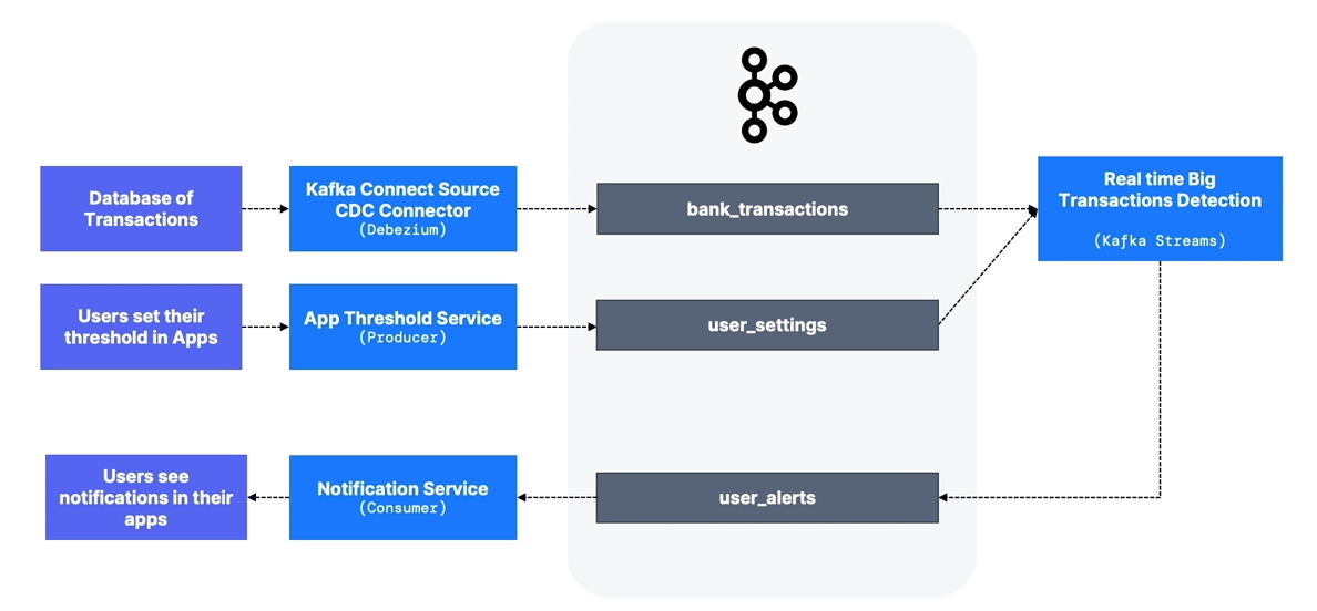 bank_transactionstopic- Use Kafka Connect Source to expose data from existing databases.