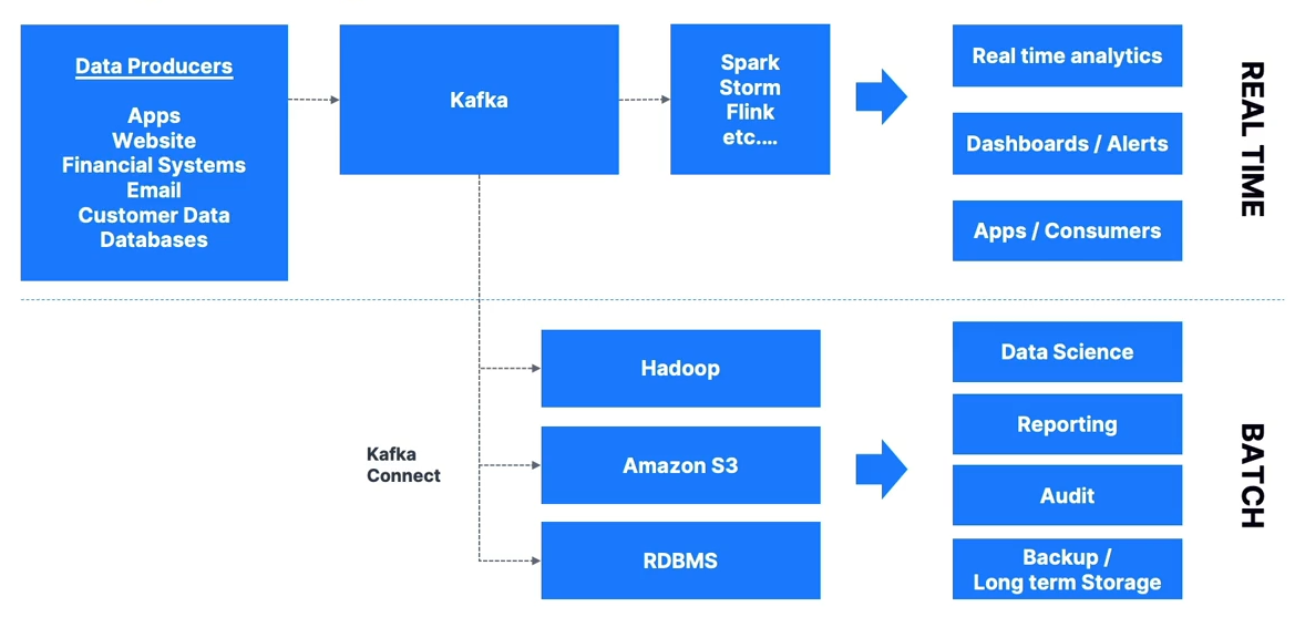 - Kafka often serves as a speed layer for real-time apps, paired with a slow layer for later analytics.