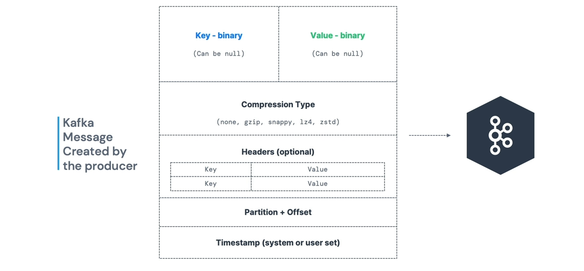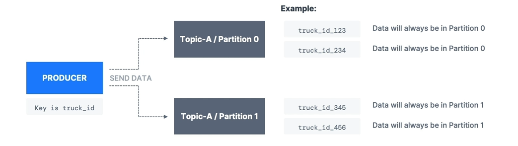 - Producers can choose to send a key with the message (string, number, binary, etc.)