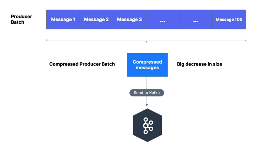 compression.typeoptions: none (default), gzip, lz4, snappy, zstd (Kafka 2.1+)- Works without broker or consumer config changes